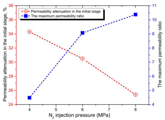 The greater the N2 injection pressure is, the greater and the more intense the compression degree of the matrix in the initial stage will become. is the matrix pressure of coal, is the fracture pressure of coal, and Km is the bulk modulus of the coal matrix. According to Equations (A1), (A2) and (A4), the smaller the magnitude of the fracture, the smaller the aperture and the permeability attenuation. When the N2 temperature is 60 °C, the permeability attenuation in the initial stage is 34.3% at a 4 MPa injection pressure, 30.5% at a 6 MPa injection pressure and 25.4% at an 8 MPa injection pressure (Figure 6). The greater the N2 injection pressure, the greater the fracture pressure and matrix pressure; thus, the effective stress will be smaller, while the adsorption expansion of the fracture surface and the matrix (i.e., and ) will be larger. According to Equations (A1), (A3) and (A4), the coal global strain increases and the fracture aperture rises, resulting in an increase of the coal permeability. Therefore, the greater the injection pressure, the greater the maximum permeability ratio. When the N2 temperature is 60 °C, this corresponds to a maximum permeability ratio of 4.48 for a 4 MPa injection pressure, 9.07 for a 6 MPa injection pressure and 10.37 for an 8 MPa injection pressure (Figure 6).
