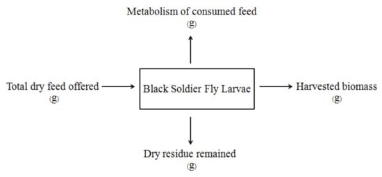 Fresh black soldier flies’ eggs were bought from MLF Ingredient Sdn Bhd located in Johor, Malaysia. Upon arrival, the eggs were transferred into clean container and left in incubator at 27 °C until eclosion. The newly hatched BSFL were collected and reared using fresh coconut endosperm waste until 6 days old, prior to the employment for experiments. A total of 20 6-day old larvae were then handpicked and reared in a plastic container with the diameter of 8 cm, and height of 10 cm, as well as equipped with perforated lid. The blended feeding substrates at different ratios were individually administrated to each of the 20 BSFL. The rearing period was ended once 80% of BSFL had reached their 5th instar stage. The mature BSFL were then harvested via individual separation from the residual feed, washed with distilled water, and deactivated in freezer at −20 °C for 10 min before being dried in an oven at 65 °C until a constant weight was obtained. The duration of larval rearing from six days old until the day on which they were deactivated, and final total weight of larvae were recorded. The feed residue was also recorded to determine the overall degradation (OD) and waste reduction index (WRI) as presented by Equations (1) and (2), respectively. The larvae’s digestibility of consumed feed was represented in terms of efficiency of conversion of digested feed (ECD) as shown in Equation (3). Finally, the metabolism of consumed feed (g) was calculated based on mass balance [15] as shown in Figure 1.