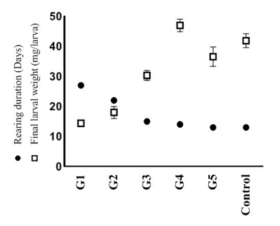 In a similar way, the rearing duration of BSFL was shorter when the amount of the propotion of PKE in the blended feeding substrate increased, i.e., it took 27 days from the larval rearing period for 80% to emerge from the 5th instar stage when fed with sewage sludge, but only 13 days whilst using G5 and control mediums. This could be ascribed by the effect of food nutrients on larval weight and rearing duration at the critical developmental stage [52,53]. The limitation of larval development to a defined time until pupation stage is affected by a shift in hormonal level at a critical developmental stage condition [54,55]. In addition, the larvae’s critical weight, i.e., the larval final weight, was also relatively constant once the larvae had stopped feeding in preparation to enter pupation [56]. The rearing duration required for larvae to reach the critical weight was dependent on the nutrition availability, since the imbalanced nutrients in feed would result in a longer time entailed for feed accumulation to compensate for nutrient deficiency [52,57,58].