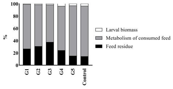 The proportion of feed converted into larval biomass, feed used for metabolism, and feed residue for each ratio of blended mediums for BSFL feeding are shown in Figure 3. The increase in feed residue when fed BSFL with G1 to G3 could be ascribed to the insufficient nutrients presented in blended sewage sludge that afflicted the palatability of BSFL. The presence of only sewage sludge in the G1 medium would cause the BSFL to prioritize the allocated energy budget in its body to maintain homeostasis by increasing metabolism of consumed feed, reducing excretion, and increasing the amount of consumed feed, leading to a lower amount of feed residue as opposed to the G2 and G3 mediums [15]. The further increase in PKE in the G2 and G3 mediums led to the higher amount of feed nutrition than required for larval growth. Thus, the feed was left over as a feed residue [15]. However, the feed residue then decreased when employing the G4, G5 and control mediums. This could be due to the imbalance of nutrition in blended feed, resulting in higher metabolism of consumed feed for these mediums. The observation was in conformity with the discussion provided for the final larval weight parameter in the presence of excess lipid and protein from PKE (Figure 2).