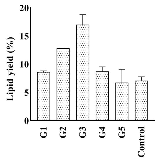 The lipid yields from BSFL fed with various blended sewage sludge ratios are shown in Figure 4. The BSFL fed with sewage sludge only offered a lipid yield of merely 8.61 ± 0.18%. The values of lipid yield increased from 8.61 ± 0.18% to 12.81 ± 0.00% when the PKE was added into the sewage sludge and reached the highest at 17 ± 1.77% when fed with sewage sludge to PKE at a ratio of 3:2 in the G3 medium. The higher larval weight resulted in higher level of lipid yield [42]. However, the further increase in PKE caused the decrease in BSFL lipid yield due to the presence of more non-fiber carbohydrate (NFC) composition. The highest larval weight was obtained with the G4 medium, while the highest lipid yield was with the G3 medium. Apart from the effect of larval weight on lipid yield, the NFC content in feed was also considered as a factor that affected the larval lipid yield. The NFC content decreased once the proportion of PKE was increased [59]. As NFC content would affect the lipid accumulation in the larval body, the lower NFC level led to a lower lipid yield as reported by Danieli et al., (2019) [60] since carbohydrates would be converted into lipids in the larval body [39]. Hence, the appropriate protein and NFC composition in feed should be considered, as the protein supply played a significant role in larval weight and lipid yield. Nevertheless, the higher protein and lower NFC condition also led to lower lipid yields from harvested BSFL biomass [39].