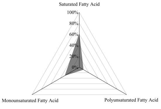 Another point to notice was that the BSFL-derived biodiesel fed with various ratios of blended sewage sludge offered an essential composition to produce high quality of biodiesel. The FAME profiles revealed the dominating content of saturated fatty acid (SFA) and low in polyunsaturated fatty acid (PUFA) as shown in Figure 5 [62]. The content of SFA also provided a similar pattern of lipid yield and C12:0, i.e., the highest SFA content was obtained in G3, which was 81.48% before the percentage of SFA dropped with the increase in PKE proportion. The FAME profile could be ascribed to the effect of larval weight and NFC content in feeding substrate on FAME composition, since a larger larval weight would lead to more accumulation of C12:0 and SFA. However, the further increase in PKE would reduce the NPC content, which influenced the C12:0 component as BSFL would synthesize C12:0 from carbohydrates presented in feed as reported by Ewald et al. (2020). The high SFA and low PUFA contents could lower a cold plugging point that affects cold flow properties. Nonetheless, the higher molecular weight of FAMEs would increase viscosity and density, and the performance of oxidative stability was good for a better storability of biodiesel [42,61,62,63,64]. Hence, the optimum proportion of blended sewage sludge should be considered to determine the optimum proportion of SFA and PUFA for producing a good quality biodiesel. Furthermore, biodiesel with a high SFA level indicates a higher cetane number than biodiesel with a high level of unsaturated fatty acid, i.e., better fuel combustion inside a compression engine [65].