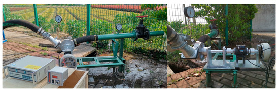 The experiment rig (see Figure 3) was located in Jiangsu Wanagda Sprinkler Co., LTD, Changzhou, China. It was an open experimental system, which consisted of the tested water turbine, water conveying pump, control valve, pipeline, magnetic particle brake, pressure transducer, magnetic flow meter, torque, and speed sensor, etc., as shown in Figure 4. The water conveying pump sucked water from the reservoir and supplied it to the tested water turbine through a pipeline after it was pressurized. The supplying water was controlled by the valve. The flow meter was installed in the pipeline between the outlet of the pump and the inlet of the turbine and was located at the upper stream of the control valve. The water turbine outlet pipe was connected to the reservoir, and the water turbine inlet and outlet pipelines were equipped with a pressure transducer.