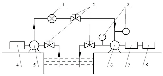 Experimental system layout. (1) Magnetic flow meter; (2) control valve; (3) pressure transducer; (4) motor; (5) water conveying pump; (6) tested water turbine; (7) torque and speed sensor; (8) magnetic particle brake.