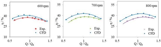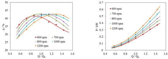Steady flow calculations for the water turbine performance at different rotational speeds were performed, as shown in Figure 6. Here, the water turbine output growth with the raise of flow rate was at the same rotational speed. The water turbine efficiency increased as the flow rate increased, to a certain extent, and then reduced as the flow rate increased further. The peak efficiency was 42.93% and it moved toward a higher flow rates as the rotational speed increased. When the turbine ran between 600 rpm and 700 rpm, the high efficiency point was biased towards a low flow rate and the high efficiency area of 700 rpm was wider than that of 600 rpm. In short, the efficiency of this water turbine is not remarkable, btu it can still be further improved, and the high efficiency range is expected to be broadened.