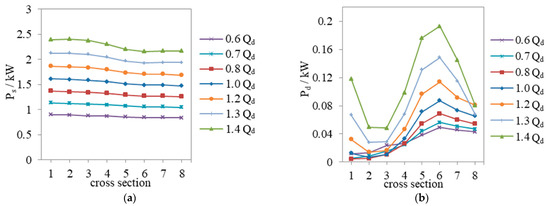 The total power included static pressure power and dynamic pressure power, which can be obtained according to Equations (7) and (8), respectively. Figure 9 gives the changes of static pressure power and dynamic pressure power on all set cross-sections of the runner at several flow rates.