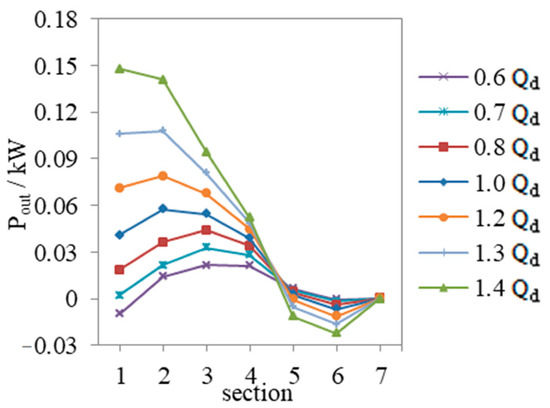 To further study the energy conversion characteristics in the runner, the variation characteristics of energy transferred to the runner in each section was analyzed. Figure 10 shows the variation curve of energy transferred to the runner in each section under different flow rates. It can be obtained that the energy received from the runner was primarily from the first four sections of the runner. The energy transferred from these four sections was in proportion to the flow rate. The first three sections of the runner obtained most of the energy, the obtained energy gradually increased as the flow rate increase, and the most energy-obtained section continuously moved from the third to the first section as the flow rate increased. For the fifth and sixth sections, the energy transferred to the runner was in inverse proportion to the flow rate. The energy obtained under small flow conditions was not much, and as the flow rate increased, these two sections not only could not obtain energy but had a counterproductive effect. Since the seventh section had no blade, the runner could hardly get the energy from this section, and the energy transferred to the runner had little correlation with the flow rate.
