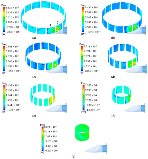 Power contour for cross-sections of the runner. (a) D = 175 mm; (b) D = 155 mm; (c) D = 135 mm; (d) D = 115 mm; (e) D = 95 mm; (f) D = 75 mm; (g) D = 55 mm.