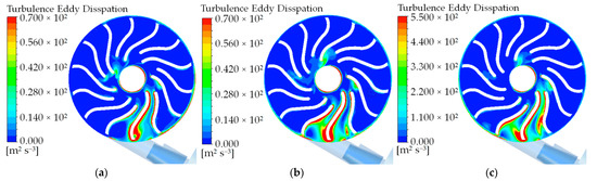 Turbulence eddy dissipation in the mid-span section of the runner. (a) 0.7Qd; (b) 1.0Qd; (c) 1.3Qd.