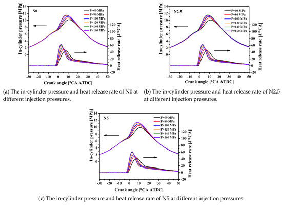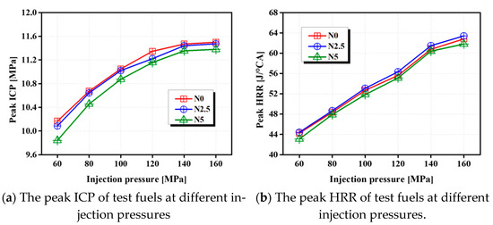 The combustion characteristics, such as the ICP and heat release rate (HRR), are the most crucial parameters directly affecting combustion characteristics, engine-out emissions, and power outputs [27]. Figure 2 shows that the ICP and HRR curves for the test fuels vary with the IP. The curves depict the nature of the maximum ICP rise along with the increased IP, and hence reflect the combustion quality. When the IP increases from 60 to 160 MPa, the peak values of the ICP for N0, N2.5, and N5 increase by approximately 13.11%, 13.14%, and 15.34%, respectively. This is because the injected fuel quantity per unit chamber increases with the increase in IP, thus increasing the ICP. A higher IP is beneficial to the secondary breakup of droplets, leading to a superior self-ignition effect [30]. As can be seen in Figure 3a, at a giving IP, with an increasing proportion of n-octanol, a slight drop in the peak ICP was shown. This is a result of the lower energy content of the n-octanol/diesel blend fuel. The position of the maximum ICP indicates the rate of this energy release, and it is mainly dependent on the oxygen structure, viscosity, and latent heat of evaporation (LHOE) of the fuel [35]. This also proves the relatively small impacts of the blending fuels on the ICP. Kumar et al. [36] researched the influence of IP on the performance of a biodiesel engine with a cerium oxide nanoparticle additive and obtained a similar result.