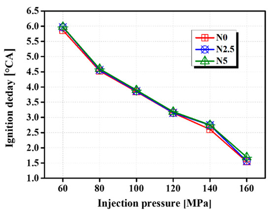The ID is a dynamic parameter representing the time interval between the beginning of fuel injection and combustion initiation. The variation in the ID with IP for the test fuels is depicted in Figure 4. The results show that, with increasing IP, the IDs of test fuels decreased. The trends were in line with the studies [38,39,40]. when the IP is less than 120 MPa, the ID presents an almost invisible increase with increases in the n-octanol proportion for the same pressure. Then, there is a slight delay when the IP is greater than 120 MPa. The results are in line with those of Prasad et al. [32], who concluded that the addition of butanol to pure diesel could prolong the ID. This phenomenon is attributed to the fuel properties, namely, the lower CN of n-octanol relative to diesel; its higher oxygen content and latent heat of vaporization also prolong the ID. In addition, the high viscosity worsens the evaporation and fuel atomization, as well as the mixing with air. The figure also shows that, for all of the test fuels, the ID varies inversely with the IP. When IP were 60–120 MPa, there were little differences in the ID values of test fuels. When the IP were increased to 140 and 160 MPa, The IDs of test fuels became obvious. The reason was that the injected fuel shows a smaller Sauter average diameter, shorter broken chain length, and greater dispersion and atomization, resulting in a shorter ID [41,42].