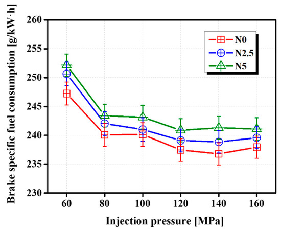 The BSFC is defined as the ratio of fuel consumption to brake power, and it is an important economic index. Figure 7 shows the change in the BSFC according to the IP for the test fuels. The BSFC slowly decreased with the increase in IP. This decline in the BSFC is the result of the larger jet penetration of the fuel spray and smaller droplet size contributing to the air–fuel mixture; as a result, the ID and BSFC are reduced. There is a slight upward trend after 120 MPa. This is because the ID will be too short if the IP is too high. In such cases, the homogeneous mixed period decreases, leading to a relatively bad combustion efficiency and lower power output [27,29], and in generating the specified brake power for the engine, lead to additional fuel consumption. Moreover, at the same level of IP, the BSFC increases with an increasing blending ratio of n-octanol, owing to the decrease in the energy content [37]. N5, which has the lowest heat value, has the highest BSFC per IP. n-Octanol has a higher LHOE in comparison with pure diesel and draws more heat from the process of fuel vaporization. Hence, the lower fuel conversion efficiency results in a higher BSFC [35]. In addition, the higher viscosity of the n-octanol worsens the fuel atomization, leading to an increase in the BSFC.