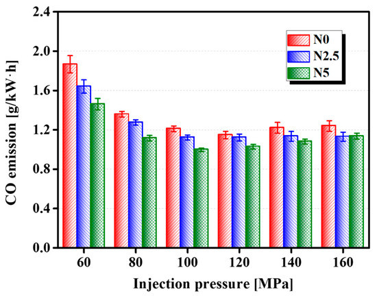 The factors that mainly affect CO emission formation are the air–fuel ratio, fuel type, fuel atomization rate, IP, and timing [41]. CO is oxidized to CO2 when the oxygen concentration is sufficient in the cylinder. Therefore, the air–fuel equivalence ratio is the primary factor controlling the formation of CO. The CO emissions at different IPs for the n-octanol/diesel blends are presented in Figure 9. CO emissions were found to decrease with the addition of n-octanol. One possible reason is that the use of n-octanol increases the number of active radicals of OH, O, and H, promoting CO oxidation by the reaction path as CO + OH = CO2 + H and O + CO + M = CO2 + M [32], in addition to the lower C/H ratio of n-octanol relative to diesel. We also observed that, when the test fuel remains unchanged, as the intensity of IP increases, the CO decreases first, and then increases. The CO emissions of N5 at 100 MPa drop by approximately 32% when compared with the operating condition of 60 MPa. This is because increasing both the IP and viscosity of n-octanol causes a quicker and earlier injection timing, enhancing the mixture of air and fuel in the combustion chamber, and thereby decreasing CO emissions [31]. However, the higher is the IP, the shorter is the combustion duration, and there may not be sufficient time for complete oxidization. Therefore, the IP has positive and negative effects on CO, and considering the various aspects comprehensively is necessary to achieve better CO emissions in the design of diesel engines.