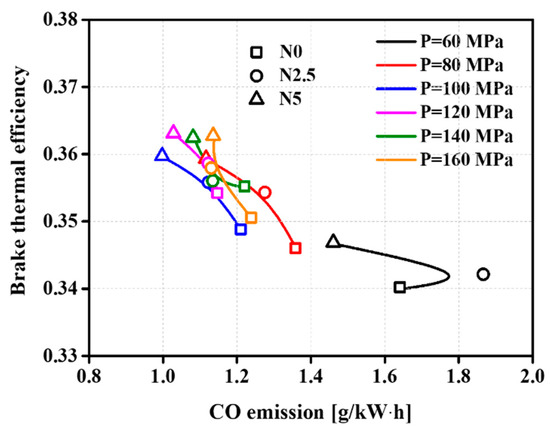 The relationship between the BTE and CO is statistically significant for characterizing the combustion effect. Higher levels of CO emissions indicate an incomplete energy conversion, which is also reflected in a lower BTE. Figure 15 is a graph showing the effect of IP on the relationship between the BTE and CO of the test fuels. As shown, under the same IP, with an increase in the mixed proportion of n-octanol, the BTE increases while the CO decreases. Furthermore, along with the boost of the IP, the BTE and CO show a reverse change trend. The variation of the BTE increases first and then decreases fractionally, and the CO decreases first and then increases slightly. From this analysis, both the n-octanol content and IP favor complete combustion. Similarly, the most satisfactory level is achieved at 100 or 120 MPa, when burning with N5.