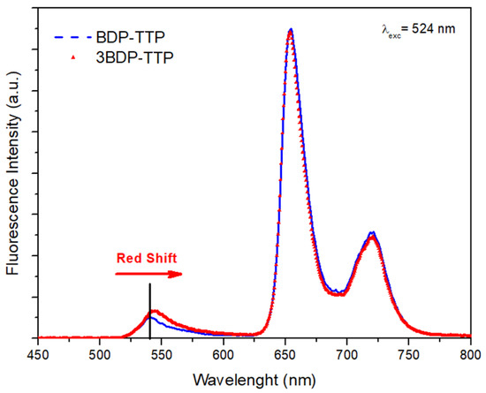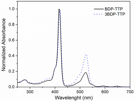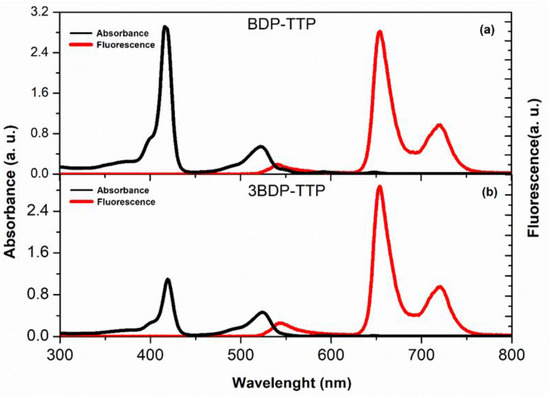 - Whited, M.T.; Djurovich, P.I.; Roberts, S.T.; Durrell, A.C.; Schlenker, C.W.; Bradforth, S.E.; Thompson, M.E. Singlet and triplet excitation management in a bichromophoric near-infrared-phosphorescent BODIPY-benzoporphyrin platinum complex. J. Am. Chem. Soc. 2011, 133, 88–96. [Google Scholar] [CrossRef][Green Version]