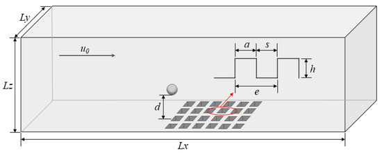 The fluid flow in a three-dimensional channel was simulated in the present research (Figure 1). The fluid was water at room temperature, and the viscosity was 0.894 × 10−3 Pa·s. The fluid was incompressible, and moved in a laminar flow with an inlet velocity of u0. The length, height, and width of the channel were, respectively, Lx = 350 µm, Ly = 60 µm, and Lz = 100 µm. The length of the microstructure area was 60 µm, and square micropits were evenly distributed on it. The depth and width of the micropits were h and s, respectively, and they were marked as Mp. The protrusion between two adjacent pits was called microridge, marked as Mr. The width of each microridge was a = 2 µm. The sizes of different micropit structures are presented in Table 1. In order to eliminate the influence of the inlet and outlet sections of the channel on the fluid state, a smooth surface with a certain length was set up at the inlet and outlet sections. The microbial model was simplified as an undeformable sphere with non-slip boundary and a radius of r, and the distance between the bottom of the microorganisms and the surface of the microstructure was d. It was assumed that the microorganisms could move forward and backward in the direction parallel to the microstructured surfaces. There are many microorganisms in the fluid, and they affect each other during the formation of fouling. In this article, we only focus on the situation where a single microorganism is affected by the fluid on the microstructured surface to analyze the factors of the antifouling mechanism, which does not mean replacing all the microorganisms in the flow field with a single microorganism. The simulation of a single microorganism can avoid the influence of a large number of microorganisms on the flow field and give a clearer demonstration of the mechanism of the microstructured surface.