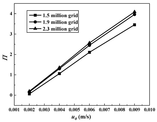 When the aggregates of meshes were 1.5, 1.9, and 2.3 million, the pressure drops in the channel at different inlet velocities were calculated, and the corresponding results are presented in Figure 3. Considering the accuracy of numerical simulations and the calculation time, the total grid number was determined to be 1.9 million, including 1.2 million in the encrypted area.