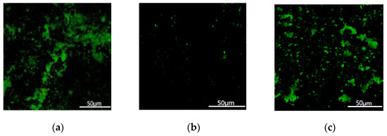 LSCM images of microbial fouling experiment silicon wafers. (a) smooth surface; (b) Mp1 microstructured surface; (c) Mp5 microstructured surface.