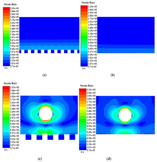 Strain rate distribution of plain surface and Mp1 microstructured surface. (a) Strain rate of plain surface without microorganisms; (b) Strain rate of Mp1 microstructured surface without microorganisms; (c) Strain rate of plain surface distribution; (d) Strain rate of Mp1 microstructured surface.