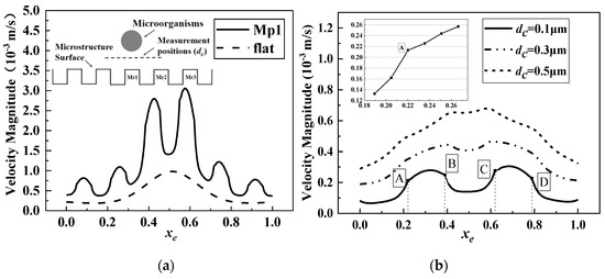 Figure 6a presents the average velocities above six microstructures. As shown in the small picture in 6a, the microorganism is now directly above the microridge. The velocity of adjacent micropits under the microorganisms is much higher than that of the other micropits. The velocity under the smooth surface changed smoothly, and the maximum velocity was only 31.25% of that for the microstructural surface. Figure 6b presents the average velocities at three different measuring positions (dc = 0.1, 0.3, and 0. 5 μm) when the height of the microbes from the surface (d) was 5 μm. The velocity fluctuation in the micropits and microridges increased with the decrease of the distance from the surface. Therefore, when the microorganisms settled in the y-direction, it was difficult for them to approach the surface and find the attachment point due to the increase in velocity. When dc = 0.1 μm, the flow velocity above the micropits was significantly higher than that in the microridges. When the microorganisms settled above the surface, it was difficult for them to maintain their balance and complete the settlement due to the change in the flow velocity. The observation points A, B, C, and D in Figure 6b are micropit steps, where the velocity changed rapidly (Inset of Figure 6b is the enlarged view of the velocity at point A). When the microorganisms moved, they vibrated due to the sudden change of the velocity and slid through the micropits with the fluid.