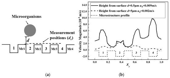 (a) Average velocity distribution above six microstructures; (b) Velocity distribution at different measuring heights of two microstructures under the microorganism.