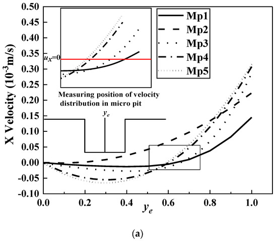According to Rosenhahn et al. [29], the rotation of algal spores in a certain place determines the adhesion strength of permanent attachment. Therefore, when microbial particles settle in a micropit, they will rotate with the vortex formed in the micropit and easily become trapped on the wall or corner of the micropit. Consequently, the closer the low-velocity region of the vortex to the bottom of the micropit, the higher the chance of biological settlement and adhesion. It is discernible from the enlarged view in Figure 9a that the intersections of the velocity distribution curves of different microstructures and the ux = 0 line differed greatly. The intersection for Mp1 was closest to the top, and those for Mp4 and Mp5 were closest to the bottom.