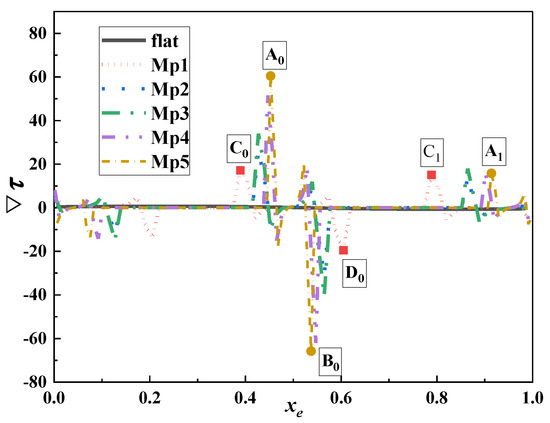 A0, B0, C0, and D0 in Figure 10 were the maximum shear stress gradients of Mp5 and Mp1 under the microorganism. According to the normalized coordinates (xe) in Table 4, these points were located at the microridge steps. A1 and C1 were the next gradient peaks of Mp5 and Mp1 in the microbial movement direction, and no significant difference in the stress gradients of the five microstructures was noticed.