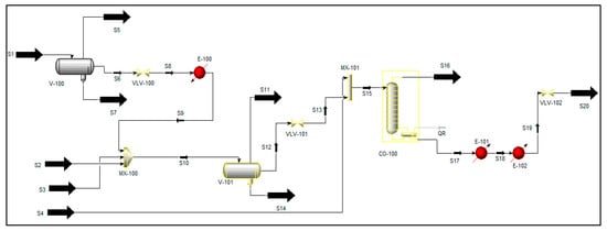 First of all, the activity coefficient method was applied but no convergence was achieved because it is inappropriate for handling the reservoir fluid mixture under examination. The phase equilibrium data (estimated 21,880 kPa and 300 °C) were high for the activity coefficient method. Invariably, the activity coefficient approach (applicable to low pressures below 10 bar) did not work. This is because the binary parameters for the NRTL, UNIQUAC, and other models are known for adopting the activity coefficient approach []. Therefore the methodology adopted in this work is the thermodynamic property method, which is a collection of property calculation routes. This is simplified in HYSYS because the properties involved are needed by unit operation models. Under this approach, the temperature function (T, Omega) involving the temperature and acentric factor (omega) was used to replace temperature function of RK/Wilson (e.g., Equation (18)). Therefore, the fugacity of each phase turns out to be a suitable thermodynamic property for handling hydrocarbon mixtures with a wide range of components. Therefore, the Peng–Robinson model was used to simulate the separation of the hydrocarbon mixture itemized in Table 1.