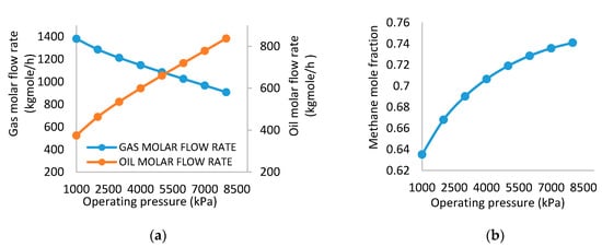 Vapor pressure and boiling points of components are proportioned directly with the system’s pressure. Consequently, increasing the pressure will reduce the tendency of some substances to evaporate (e.g., they enter the separator at a temperature below its saturated temperature, i.e., reduce the chance to change its phase from liquid to vapor phase). The effect of feed stream pressure on vessel outlet flow rates is presented in Figure 2a. As the feed inlet pressure increased from 1000 to 8000 kPa, there was a corresponding decrease in the gas flow rate from 1213 to 908.6 kg mol/h. The increment in the pressure increases the boiling point of the reservoir fluid as a result of the increase in vapor pressure of the stream components. This trend is in agreement with the results obtained by Al-Mhanna []. Hence, only less vapor can be formed which implies that the vapor flow rate will decrease. For hydrocarbons, heavier molecules condense into the oil phase when there is an increase in pressure. Under this condition, the oil flow rate increased from 374 to 838 kg mol/h. The trend in pressure and flow rate of oil outlet of the separator is shown in Figure 2a.
