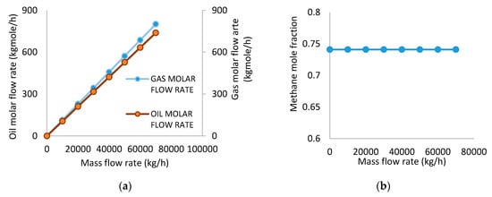 Figure 4a,b presents the results obtained from the variation of the feed mass flow rate on the molar flow rate of the gas, molar flow rate of the oil, and mole fraction of methane in the gas stream, while the temperature, pressure, and feed composition were kept constant.