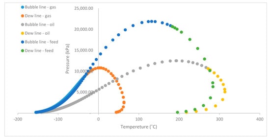 Phase envelopes were then obtained for gas and oil streams. The phase envelopes were generated using HYSYS. The Peng–Robinson model (or thermodynamics package) was used to obtain the critical point, the dew lines, and the boiling point lines of each stream (gas and oil).