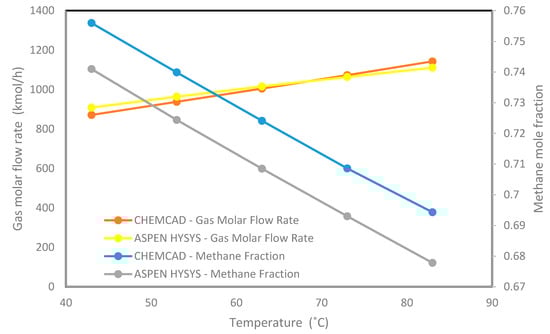 Figure 7 shows that increasing the operating temperature from 43 °C to 83 °C moves the gas flow rate from 871.15 to 1142.98 kmol/h and from 908.6 to 1111 kmol/h by using CHEMCAD and Aspen HYSYS, respectively. These increments in gas flow rates are due to the vaporization of hydrocarbons as the temperature tends to 83 °C, the saturation temperature of the fluid reached in the separator. This is an indication that the outlet vapor flow rate is dependent on inlet temperature, having a low range of methane fraction which is from 0.75 to 0.69 (CHEMCAD) and from 0.7410 to 0.6778 (Aspen HYSYS). It is also an indication that the mole fractions obtained from both simulations are in agreement.