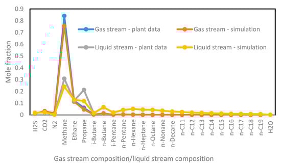 The composition of outlet gas and liquid streams for simulations and plant data.