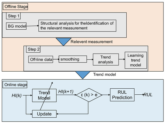The presented approach is given in three steps, as illustrated in Figure 1. The first two steps are offline analysis steps. The first one concerns the use of a generic BG model of the system for causal and structural analysis in order to identify the causal path between measures and all BG elements whose variation represents a degradation. The presence of the causal path formally demonstrates that the measurement is sensitive to the fault considered. The second step of the offline analysis is to demonstrate that the variables selected in the first step satisfy the monotonicity condition, which is necessary for the usability of the selected measurement as an HI for failure prognosis. Then, the initial values of the state model are identified. The last step is the online monitoring, where the state model is implemented and updated online, and then an RUL is predicted by a time projection of the HI estimation until a predefined failure threshold.