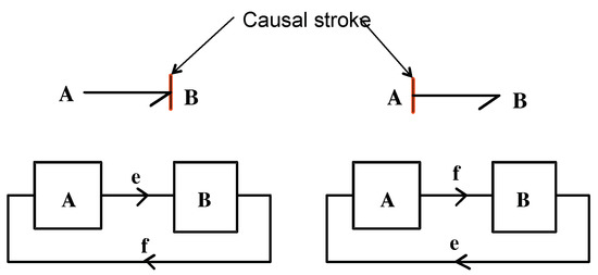 The notion of causality is one of the major advantages of the BG methodology. It allows one to highlight, in the block diagram sense, the relationships of: cause–effect, input–output, and known–unknown variables. The causality rule in a BG model is defined, by convention, as illustrated in Figure 2: The causal stroke is placed near (or far from) the element for which the effort (or flow) is an input (known).