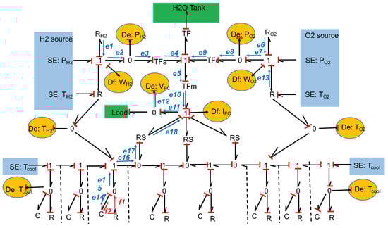 where n is the number of electrons exchanged during the reaction and F is the Faraday constant (96,485 C/mol). In the proposed BG model, there are 10 sensors that make it possible, respectively, to measure the mass flow, the hydrogen and oxygen temperatures, the hydrogen and oxygen pressures, the current at the terminals of the stack, and the voltage. The elements and represent the valves that control the hydrogen and oxygen input flow rates. These R elements are, in general, modeled by an information bond representing the valve control signal. The R element represents friction through the diffusion layers. The thermal losses are modeled by the element, which corresponds to an active resistance and represents the losses in the activation layer, the losses in the diffusion layers, and the losses due to the concentration.