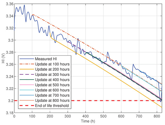 The result of the estimation and updating of the HI is given in Figure 8. This result shows that after each update, a degradation trajectory is generated by the data-driven state model as a function of the current state of the system (value of the HI at the present time). This update makes it possible to take accelerations or decelerations of the degradation process into account. It can be noticed that each update gives an end-of-life (EOL) value. This property is used to calculate a sliding RUL that takes all the dynamics observed on the health index into account.