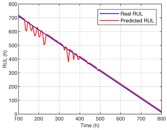 The RUL estimation error is given in Figure 10. It shows that the estimation error of the RUL remains acceptable, within a confidence interval of less than 60 h. The prediction error is then reduced considerably when one approaches the real RUL at time t = 500 h, where the prediction error represents less than 20 h, i.e., less than a day of operation.