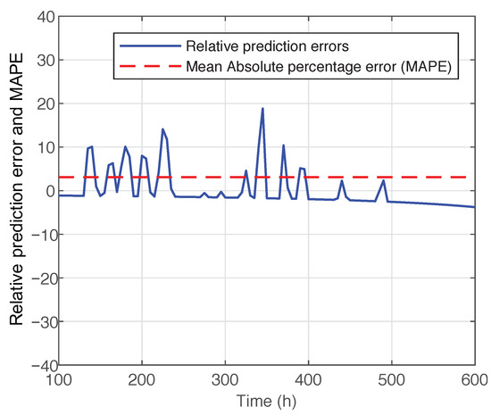 To better quantify the performance of the failure prognosis method proposed in this work, the relative error and the mean absolute percentage error (MAPE) are calculated and given in Figure 11. This figure shows a relative error of less than 20% and an MAPE of less than 5%. These results show that the performance of the proposed method is acceptable.