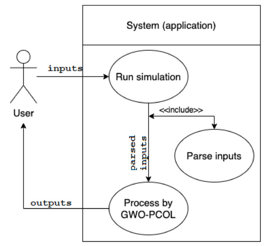 First, we provide a general analysis of the application. The use case diagram presented in Figure 1 gives us a clear overview of the basic functions that are provided by the application. The single-user application allows us to run the simulation of the GWO algorithm, simulated by the 2D P colony based on the inputs given by the user.