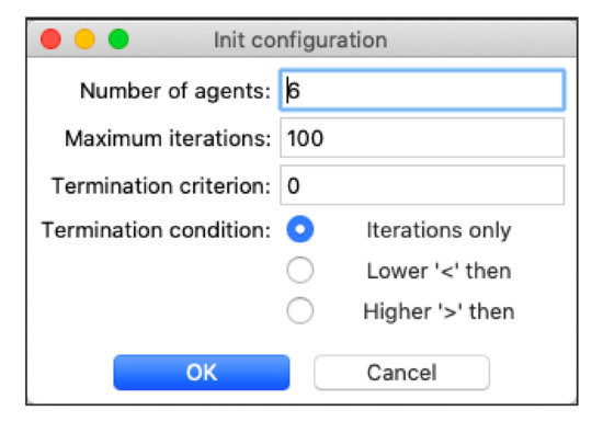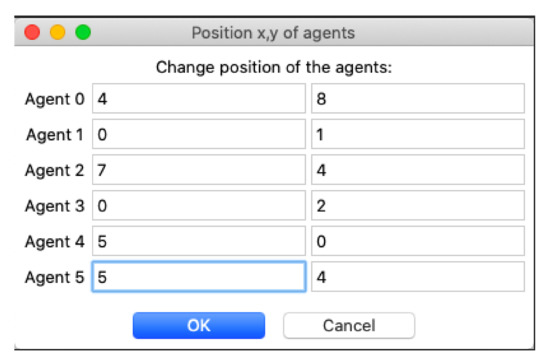 When the environment file has been selected and displayed on the canvas, the simulation can be initialized (Menu → Simulation → Initialization). Before initializing the agents and placing them into the environment, it is possible to adjust the configuration of the algorithm, and the positions of the agents, in separate windows (see Section 5.3, and Table 4).