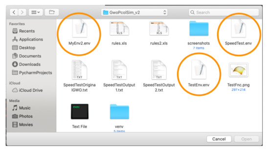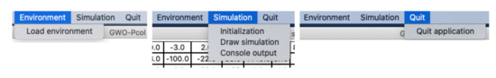 Figure 16 shows the main application window at startup. At this point, the canvas displaying the simulation is empty, so the environment should be loaded (Menu → Environment → Load environment). A file dialog window (see Figure 8) opens, and the user selects an environment file ( file).