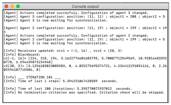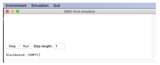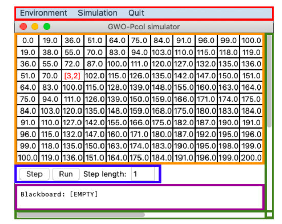 The user controls the application using the buttons that are described in Section 8.3. During the simulation, the user can monitor the console output, the canvas visualizing the simulation (to see agents and their movements in the environment), and the blackboard (for example, to see the best values of Alpha, Beta, and Delta agents).