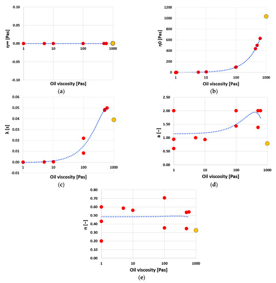 Based on available the literature data, the parameter estimation results of silicone oil with six different viscosities (1, 5, 10, 100, 500 and 600 Pas) were compared to the obtained model parameters of the current work, at room temperature, in Figure 6. The comparison shows a good coincidence, as the parameters fit the trend line or are situated in the close scatterplot of the literature data. See the interpretation of the presented results after Figure 6.