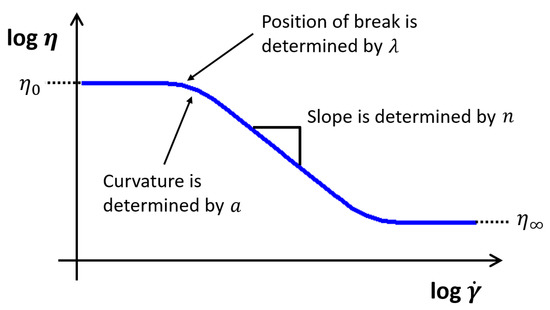 The Carreau–Yasuda model, which had been used in several previous works [17,18], is considered the most suitable for describing the viscous behavior of pseudoplastic non-Newtonian fluids in both the linear and nonlinear ranges. The general formula of the Carreau–Yasuda model is presented by Equation (3) [26]: