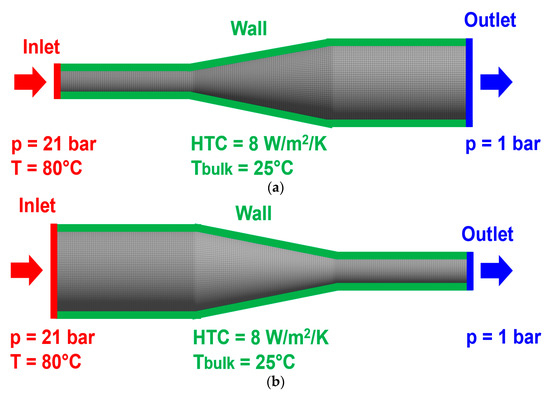 Two simulation cases were performed on the tube geometry presented in Section 4.1. In the first case, called diffuser simulation, the “Inlet” boundary condition was defined on the tube end with smaller diameter, while the other end of the tube, with the larger diameter, was set as “Outlet” boundary. In the second case, called confusor simulation, the roles of the boundaries are replaced according to Figure 10a,b. A total pressure of 21 bar on the “Inlet” boundary passes silicone oil at 80 °C, through the tube against the “Outlet” boundary that is at atmospheric pressure (1 bar).
