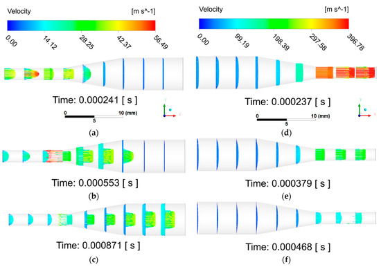 Figure 13 displays the velocity profile by vectors along the geometry for both diffuser and confusor simulation case in the selected timesteps. The free jet of silicone oil propagation through the calm air domain can be well observed in Figure 13a–c. In terms of confusor simulation case, high velocity vectors (see Figure 13d,e) show well how the air is pushed out of the straight tube with smaller diameter by the oil.