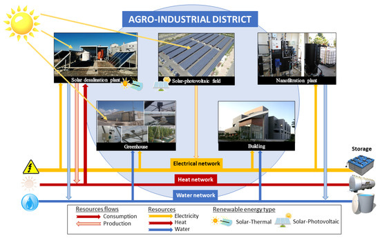Although all the aforementioned studies presented satisfactory results, the proposed techniques are focused on optimizing the transport water network by minimizing the operational costs. However, in most cases, not only the water needs to be optimally managed but also energy trading. The presence of desalination plants and other non conventional water sources introduces new agents of intermittent nature in the problem, as they are normally powered by renewable energy to improve their efficiency [14,15] and to reduce water costs [16]. In addition, adequate storage systems [17] and the use of the public utility network as a backup are required for their continuous operation. These elements, together with the related industries and greenhouses’ necessities, make the whole system to constitute an agro-industrial district [18] in which the generation, storage, and distribution of heterogeneous resources must be optimally performed for its efficient proper exploitation.