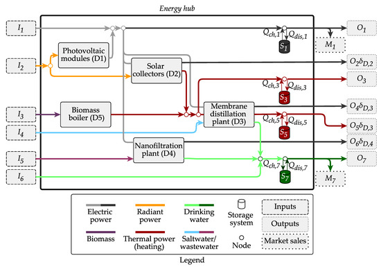 Lastly, is the vector containing the price of each input and is the vector containing the price of sold resources (in terms of energy, mass, or volume) and owing to the use of the public utility networks for both importing and exporting electricity and water, Equations (6) and (7) are considered as constraints in ODEHubs:
