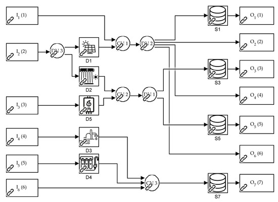 Let and be the transpose operator and the operator that returns a square diagonal matrix with the elements of a vector, respectively, and consider any variable written in bold font as the distinctive form of matrices and vectors. Notice also that the energy hub in Figure 2 counts with six inputs, seven outputs, 15 paths between inputs and outputs (see Table 2), and five conversion devices with a single input and output.